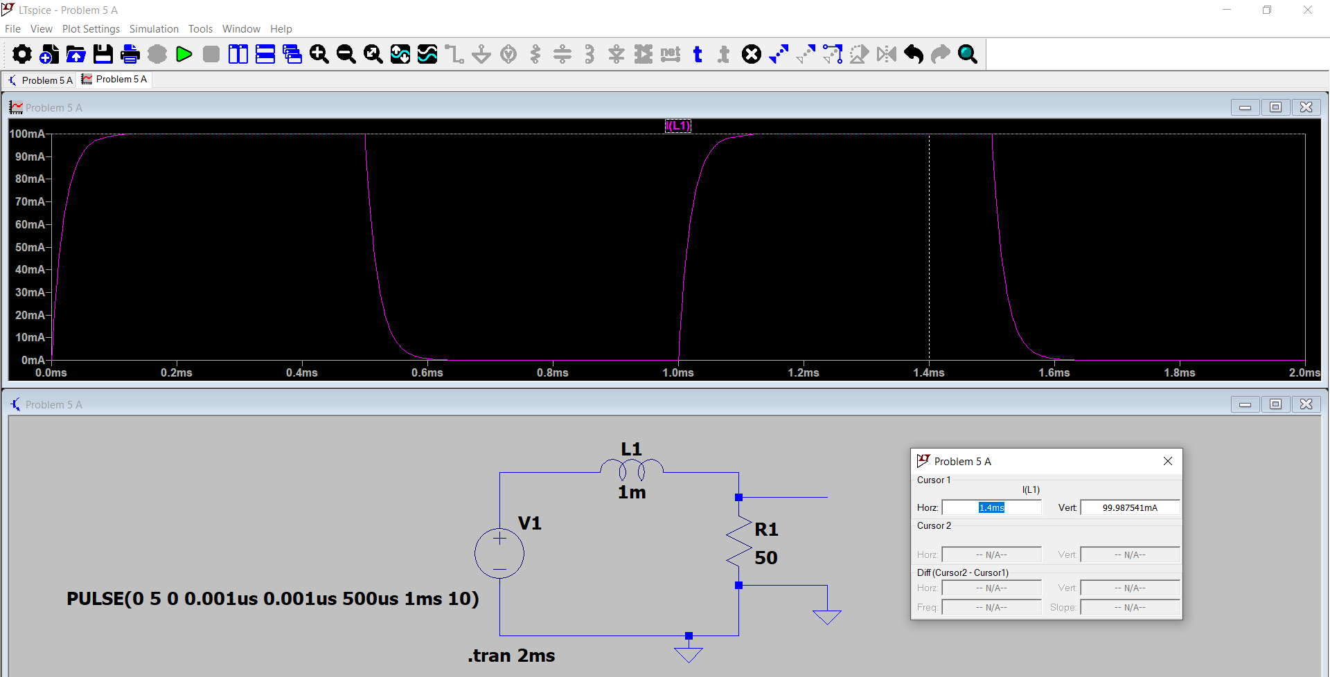 Which exactly matches the 100mA current seen in LTspice (just read the top line of the graphed current below which is taken from the inductor, L1).
